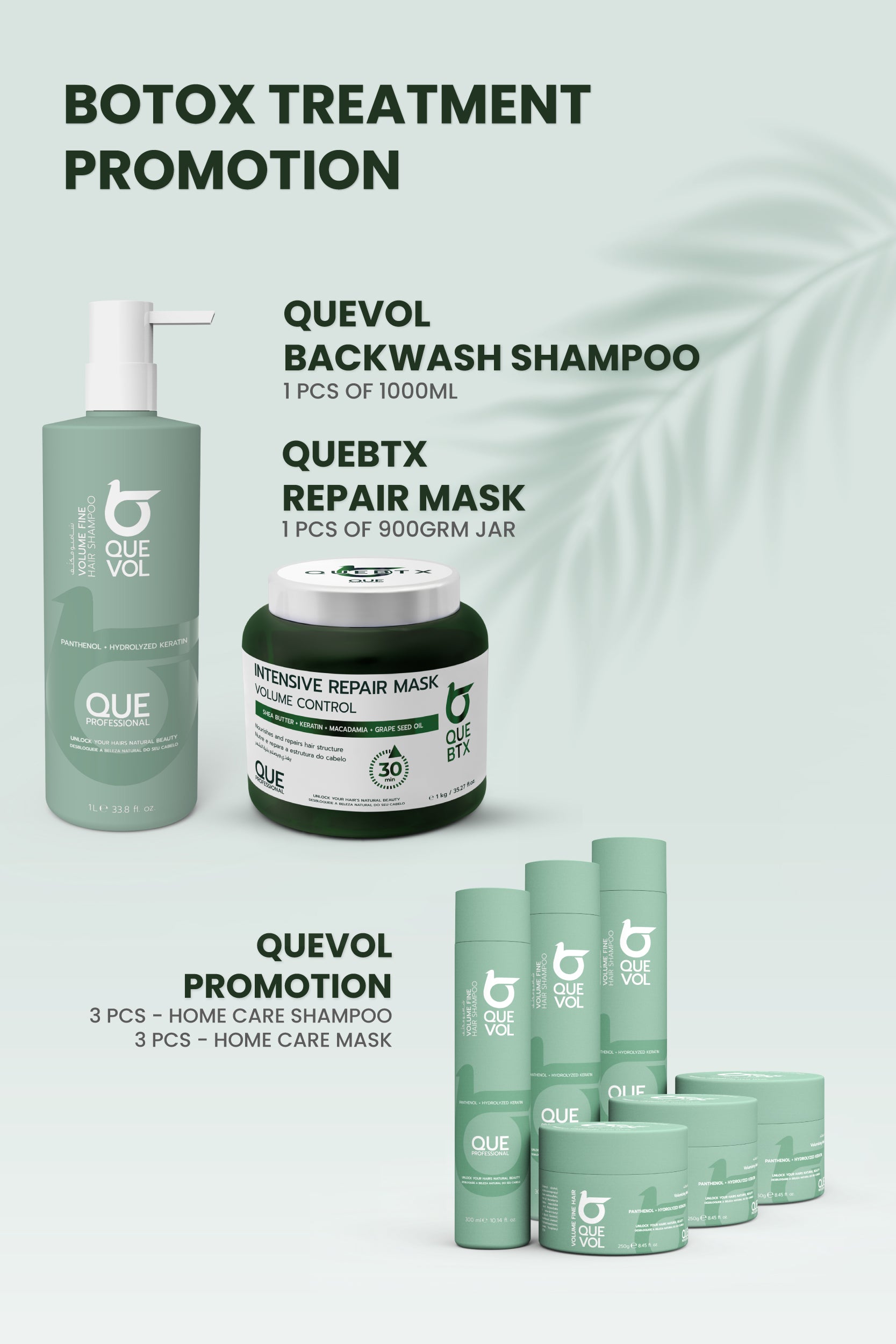 جددي شعركِ مع مجموعة علاج البوتوكس من كيوفول! يشمل هذا العرض شامبو باك واش سعة 1000 مل، وعبوة قناع إصلاح كيوبتكس سعة 900 غرام، وثلاثة شامبو وقناع للعناية المنزلية، بسعر 375.00 درهمًا إماراتيًا. هذه المجموعة غنية بالمكونات المغذية، وتوفر إصلاحًا وترطيبًا مكثفًا للشعر.