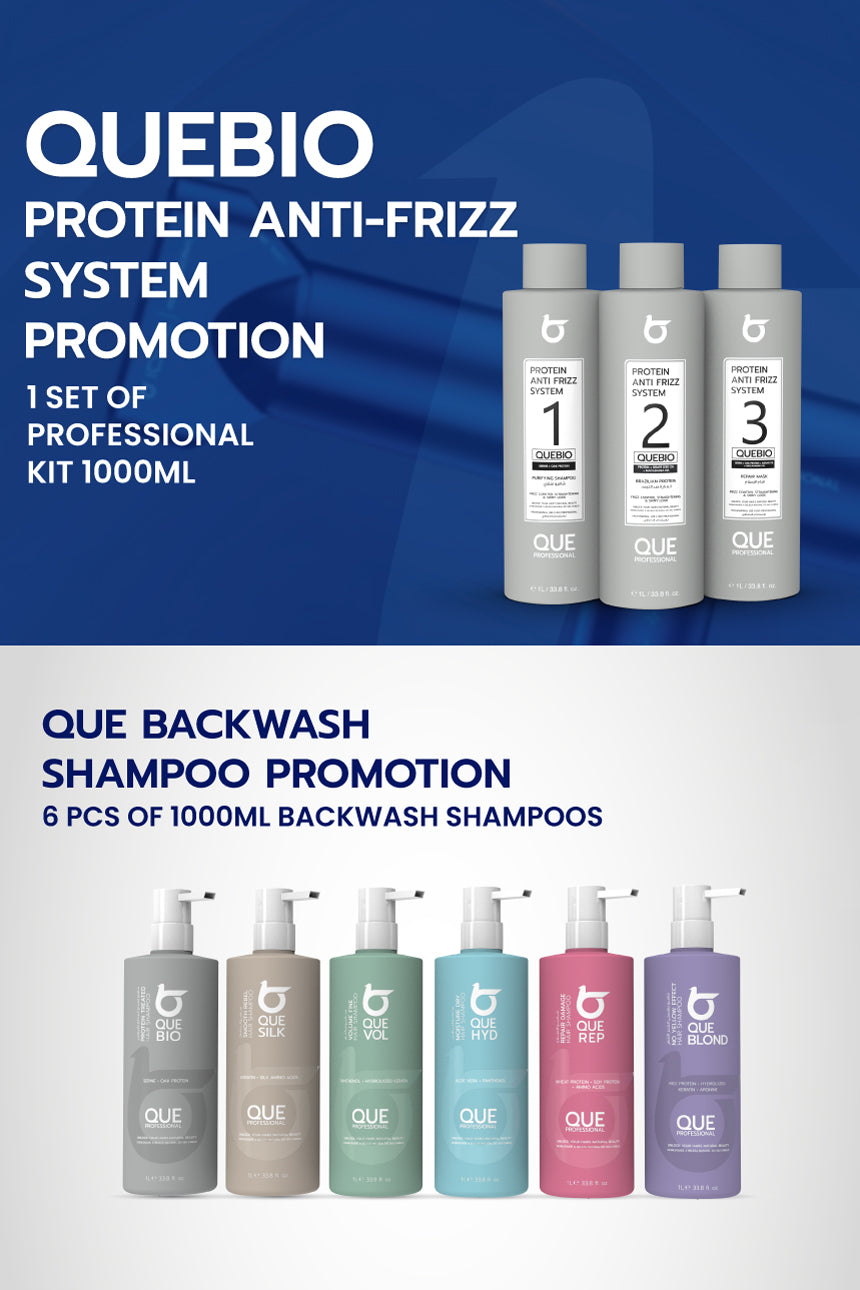 ابدأ رحلة تجعد شعرك مع مجموعة QUEBIO المبتدئة لنظام تجعد الشعر! تتضمن هذه المجموعة مجموعة بروتين لتجعد الشعر، بالإضافة إلى 6 قطع من شامبوهات الغسيل العكسي سعة 1000 مل، بسعر 850 درهمًا إماراتيًا فقط.