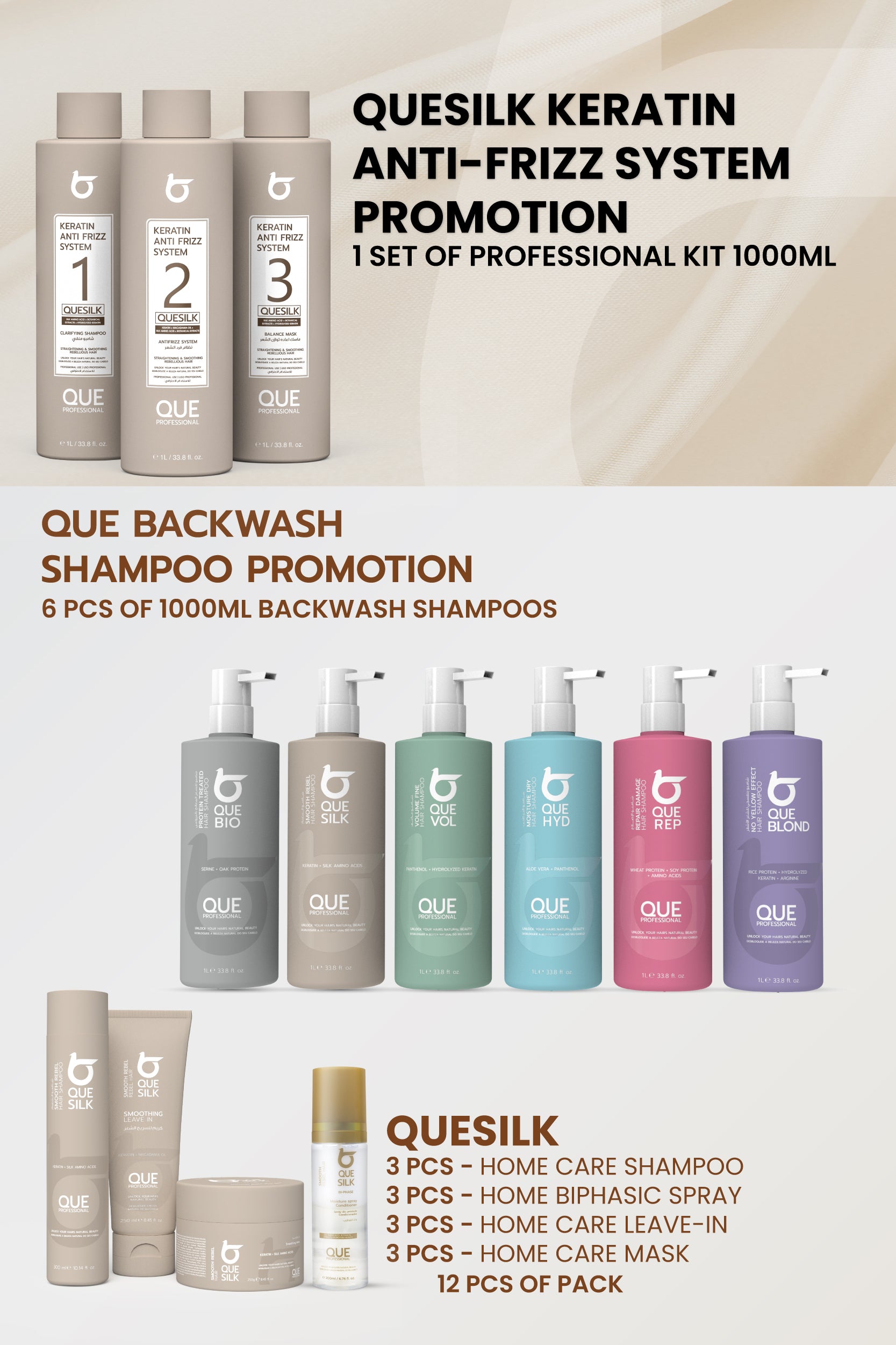 احصلي على شعر حريري وخالٍ من التجعد مع مجموعة QUESILK الاحترافية لمكافحة التجعد! تتضمن هذه المجموعة نظام كيراتين لمكافحة التجعد مقابل 1000 درهم إماراتي فقط، بالإضافة إلى 6 أنواع من شامبو الغسيل العكسي سعة 1000 مل، و3 أنواع من شامبو العناية المنزلية، وبخاخ ثنائي الطور، وماسك يُترك على الشعر.