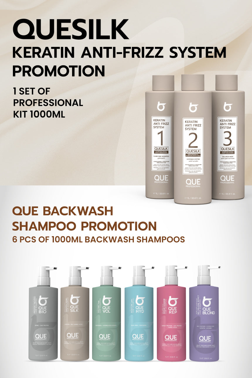 احصلي على شعر ناعم كالحرير مع مجموعة QUESILK Keratin Anti-Fries Essentials! تتضمن هذه المجموعة الاحترافية مجموعة واحدة من شامبو Backwash سعة 1000 مل ونظام الكيراتين المتطور Anti-Fries مقابل 600 درهم إماراتي فقط. تعمل هذه المجموعة على ترويض التجعد وتعزيز لمعان الشعر.